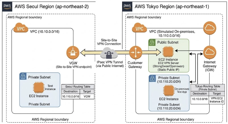 # 목적지: 10.10.0.0/16 (서울) -> 대상: i-xxxx (도쿄 VPN 서버 인스턴스 ID)4. 핵심 체크포인트