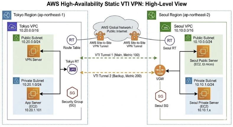 10.10.0.0/16(서울) →i-xxxx(도쿄 VPN 서버 ID) 추가. - VPN 서버 인스턴스: Source/Dest. Check를 반드시 **중지(Stop)**로 설정.