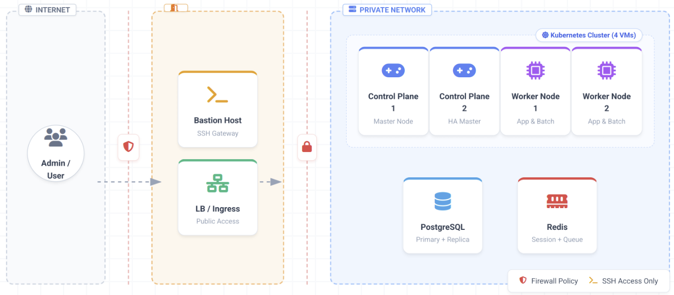 • 내부 인프라에 대한 직접 접근 완전 차단 • 외부 → Bastion → 내부 노드 단일 진입 경로만 허용 • SSH 및 kubectl 관리 전용 접근 제어 서버