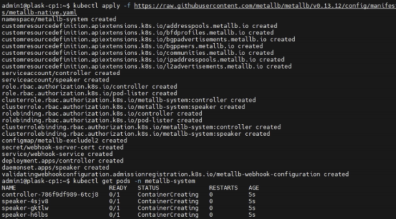 - Container Runtime 설치, Kubernetes 구성 요소 설치, Control Plane 초기화, kubectl 설정, Calico CNI 설치, Control Plane 및 Worker Node join, Ingress NGINX 설치, MetalLB 설치, 기본 StorageClass 생성, Namespace 생성