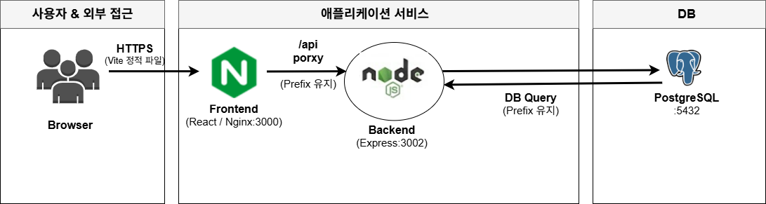 설명 : 기존 아키텍처는 단일 프로세스 기반의 선형 흐름으로 구성되어 있었다. 모든 사용자 요청은 Frontend를 통해 유입된 후 Backend로 전달되었으며, Backend는 요청을 동기적으로 처리하고 PostgreSQL에 직접 쿼리를 실행하여 결과를 반환하는 구조였다. 이 구조에서 각 계층은 물리 서버 단위로 운영되었고, 부하 분산 메커니즘 없이 단일 인스턴스로 모든 트래픽을 처리하였다. 운영 자동화 체계 또한 부재하여 배포·복구·스케일링 모두 수동으로 수행되었다.